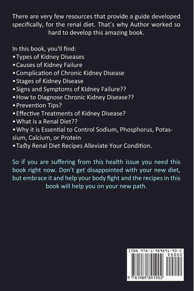 There are very few resources that provide a guide developed specifically, for the renal diet. That's why Author worked so hard to develop this amazing book. In this book, you'll find:Types of Kidney Diseases Causes of Kidney Failure Complication of Chronic Kidney Disease Stages of Kidney Disease Signs and Symptoms of KIdney Failure?? How to Diagnose Chronic Kidney Disease?? Prevention Tips? Effective Treatments of Kidney Disease? What is a Renal Diet?? Why it is Essential to Control Sodium, Phosphorus, Potassium, Calcium, or Protein Tasty Renal Diet Recipes Alleviate Your Condition. So if you are suffering from this health issue you need this book right now. Don't get disappointed with your new diet, but embrace it and help your body fight and the recipes in this book will help you on your new path.