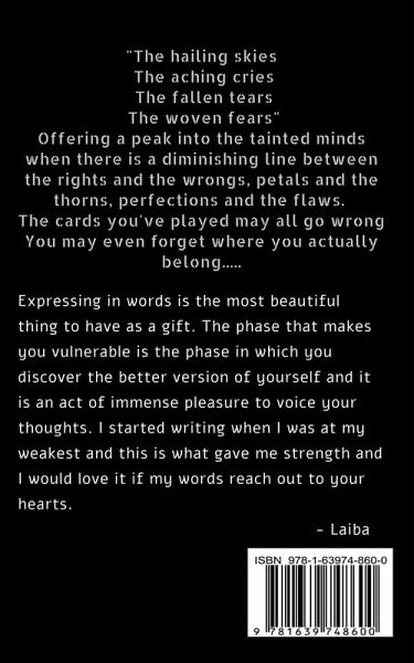 The hailing skies The aching cries The fallen tears The woven fears Offering a peak into the tainted minds when there is a diminishing line between the rights and the wrongs, petals and the thorns, perfections and the flaws. The cards you've played may all go wrong You may even forget where you actually belong Expressing in words is the most beautiful thing to have as a gift. The phase that makes you vulnerable is the phase in which you discover the better version of yourself and it is an act of immense pleasure to voice your thoughts. I started writing when I was at my weakest and this is what gave me strength and I would love it if my words reach out to your hearts.