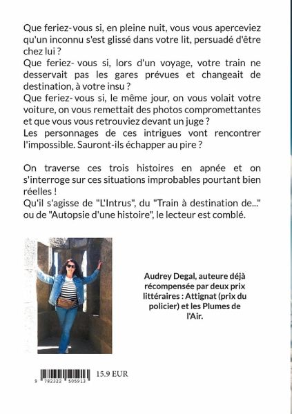 Que feriez-vous si, en pleine nuit, vous vous aperceviez qu'un inconnu s'est glissé dans votre lit, persuadé d'être chez lui ?Que feriez-vous si, lors d'un voyage, votre train ne desservait pas les gares prévues et changeait de destination, à votre insu ?Que feriez-vous si, le même jour, on vous volait votre voiture, on vous remettait des photos compromettantes et que vous vous retrouviez devant un juge ?Les personnages de ces intrigues vont rencontrer l'impossible. Sauront-ils échapper au pire ?On traverse ces trois histoires en apnée et on s'interroge sur ces situations improbables pourtant bien réelles !Qu'il s'agisse de "L'Intrus", du "Train à destination de..." ou de "Autopsie d'une histoire", le lecteur est comblé.