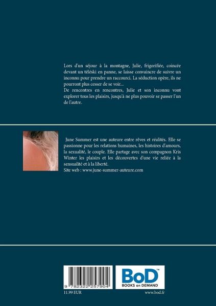 Lors d'un séjour à la montagne, Julie, frigorifiée, coincée devant un téléski en panne, se laisse convaincre de suivre un inconnu, qui lui propose de prendre un raccourci pour rentrer plus vite à la station. La séduction opère, ils ne pourront plus cesser de se voir...De rencontres en rencontres, Julie et son inconnu vont explorer tous les plaisirs, jusqu'à ne plus pouvoir se passer l'un de l'autre.Mais parviendront-ils à s'affranchir de leur quotidien pour construire un avenir à deux?Ce livre fait partie de la série DEUX PLUMES POUR DEUX AMANTS, ainsi que ZigZag Café et Sex School. Ces trois livres vous sont contés par par un duo d'amants-complices,pour plus de plaisir...