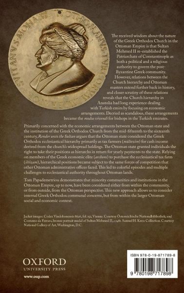 The received wisdom about the nature of the Greek Orthodox Church in the Ottoman Empire is that Sultan Mehmed II reestablished the Patriarchate of Constantinople as both a political and a religious authority to govern the post-Byzantine Greek community. However, relations between the Church hierarchy and Turkish masters extend further back in history, and closer scrutiny of these relations reveals that the Church hierarchy in Anatolia had long experience dealing with Turkish emirs by focusing on economic arrangements. Decried as scandalous, these arrangements became the modus vivendi for bishops in the Turkish emirates. Primarily concerned with the economic arrangements between the Ottoman state and the institution of the Greek Orthodox Church from the mid-fifteenth to the sixteenth century, Render Unto the Sultan argues that the Ottoman state considered the Greek Orthodox ecclesiastical hierarchy primarily as tax farmers (multezim) for cash income derived from the church's widespread holdings. The Ottoman state granted individuals the right to take their positions as hierarchs in return for yearly payments to the state. Relying on members of the Greek economic elite (archons) to purchase the ecclesiastical tax farm (iltizam), hierarchical positions became subject to the same forces of competition that other Ottoman administrative offices faced. This led to colorful episodes and multiple challenges to ecclesiastical authority throughout Ottoman lands. Tom Papademetriou demonstrates that minority communities and institutions in the Ottoman Empire, up to now, have been considered either from within the community, or from outside, from the Ottoman perspective. This new approach allows us to consider internal Greek Orthodox communal concerns, but from within the larger Ottoman social and economic context. Render Unto the Sultan challenges the long established concept of the 'Millet System', the historical model in which the religious leader served both a civil as well as a religious authority. From the Ottoman state's perspective, the hierarchy was there to serve the religious and economic function rather than the political one.