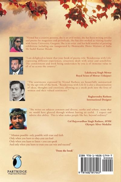 "Rendezvous with Life" is an ensemble of poems, a flight of fantasy, expressing different experiences, situations dealt with sense and sensibility. Hailing from the 'Royal blood of Bikaner', an artist by profession and passion a dreamer by nature, an iconoclast by conduct the verses and couplets reflects the moods and moments splashes of varied colours, replete with creativity and dexterity. This book is indeed a tryst with self, society and destiny. The auther has drawn inspiration from events in every day life and interaction with the environment 'Yes we can' was inspired by President Obama's famous phrase. 'Being Human' is a take on a cause espoused by Salman Khan, after an interaction with him at NSG (National Security Guard). 'Hope Against Hope' has optimistic fervor, "Veil- The Purdha ---- is a sound protest, 'Millions Dollar Smile" is a satire on man dominated system, "Heroic Rajput Heroines" is a song of glory and Valour of a bygone era