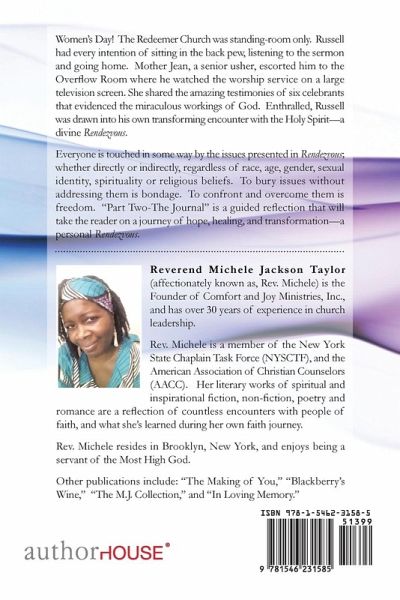 Womens Day! The Redeemer Church was standing-room only. Russell had every intention of sitting in the back pew, listening to the sermon and going home. Mother Jean, a senior usher, escorted him to the Overflow Room where he watched the worship service on a large television screen. She shared the amazing testimonies of six celebrants that evidenced the miraculous workings of God. Enthralled, Russell was drawn into his own transforming encounter with the Holy Spirita divine Rendezvous. Everyone is touched in some way by the issues presented in Rendezvous; whether directly or indirectly, regardless of race, age, gender, sexual identity, spirituality or religious beliefs. To bury issues without addressing them is bondage. To confront and overcome them is freedom. Part Two-The Journal is a guided reflection that will take the reader on a journey of hope, healing, and transformationa personal Rendezvous.