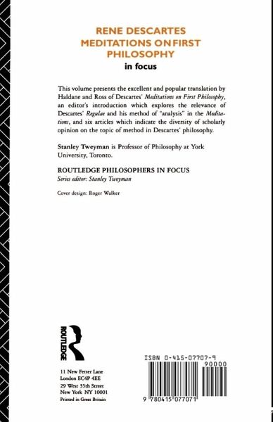 This volume presents the excellent and popular translation by Haldane and Ross of Descartes' Meditations on First Philosophy, an introduction by Stanley Tweyman which explores the relevance of Descartes' Regulae and his method of analysis in the Meditations, and six articles which indicate the diversity of scholarly opinion on the topic of method in Descartes' philosopy.