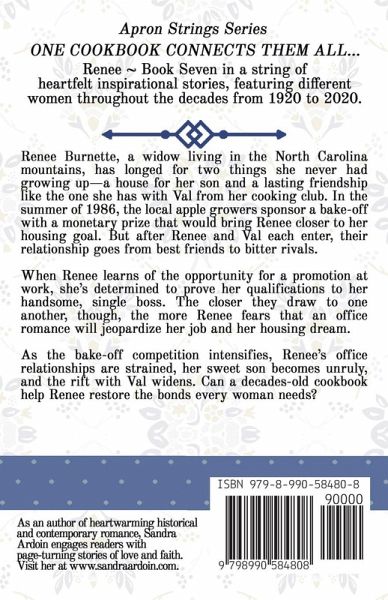 One cookbook connects them all... Renee Book Seven in a string of heartfelt inspirational stories, featuring different women throughout the decades from 1920 to 2020. Renee Burnette, a widow living in the North Carolina mountains, has longed for two things she never had growing up-a permanent home and a lasting friendship like the one she has with Val from her cooking club. In the summer of 1986, the local apple growers sponsor a bake-off with a monetary prize that would bring Renee closer to her housing goal. But after Renee and Val each enter, their relationship goes from best friends to bitter rivals. When Renee learns of the opportunity for a promotion at work, she's determined to prove her qualifications to her handsome, single boss. The closer they draw to one another, though, the more Renee fears that an office romance will jeopardize her job and her housing dream. As the bake-off competition intensifies, Renee's office relationships are strained, her sweet son becomes unruly, and the rift with Val widens. Can a decades-old cookbook help Renee restore the bonds every woman needs?