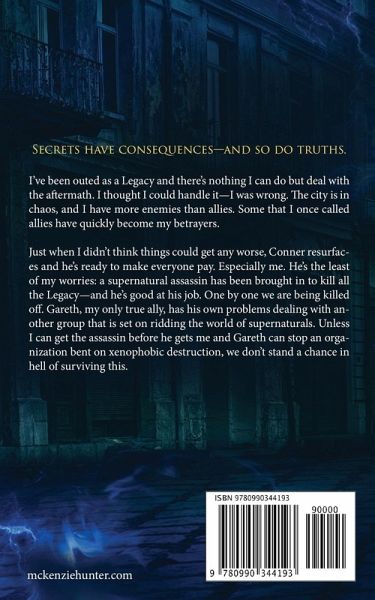 Secrets have consequences-and so do truths. I've been outed as a Legacy and there's nothing I can do but deal with the aftermath. I thought I could handle it-I was wrong. The city is in chaos, and I have more enemies than allies. Some that I once called allies have quickly become my betrayers. Just when I didn't think things could get any worse, Conner resurfaces and he's ready to make everyone pay. Especially me. He's the least of my worries: a supernatural assassin has been brought in to kill all the Legacy-and he's good at his job. One by one we are being killed off. Gareth, my only true ally, has his own problems dealing with another group that is set on ridding the world of supernaturals. Unless I can get the assassin before he gets me and Gareth can stop an organization bent on xenophobic destruction, we don't stand a chance in hell of surviving this.