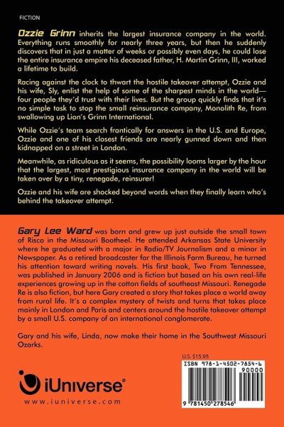Ozzie Grinn inherits the largest insurance company in the world. Everything runs smoothly for nearly three years, but then he suddenly discovers that in just a matter of weeks or possibly even days, he could lose the entire insurance empire his deceased father, H. Martin Grinn, III, worked a lifetime to build. Racing against the clock to thwart the hostile takeover attempt, Ozzie and his wife, Sly, enlist the help of some of the sharpest minds in the world-four people they'd trust with their lives. But the group quickly finds that it's no simple task to stop the small reinsurance company, Monolith Re, from swallowing up Lion's Grinn International. While Ozzie's team search frantically for answers in the U.S. and Europe, Ozzie and one of his closest friends are nearly gunned down and then kidnapped on a street in London. Meanwhile, as ridiculous as it seems, the possibility looms larger by the hour that the largest, most prestigious insurance company in the world will be taken over by a tiny, renegade, reinsurer! Ozzie and his wife are shocked beyond words when they finally learn who's behind the takeover attempt.