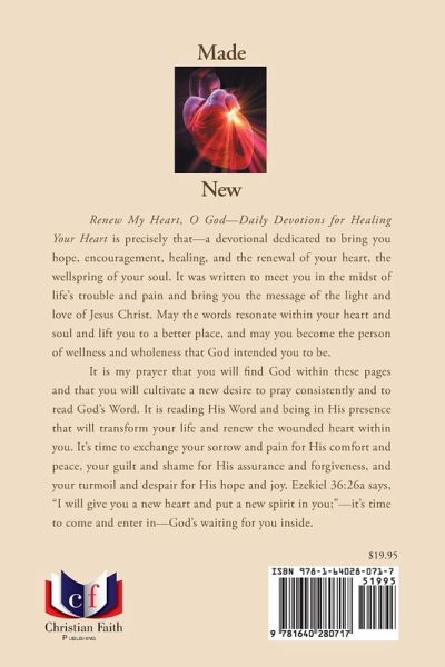 Your heart, made new. Renew My Heart, O God-Daily Devotions for Healing Your Heart is precisely that-a devotional dedicated to bring you hope, encouragement, healing, and the renewal of your heart, the wellspring of your soul. It was written to meet you in the midst of life's trouble and pain and bring you the message of the light and love of Jesus Christ. May the words resonate within your heart and soul and lift you to a better place, and may you become the person of wellness and wholeness that God intended you to be. It is my prayer that you will find God within these pages and that you will cultivate a new desire to pray consistently and to read God's Word. It is reading His Word and being in His presence that will transform your life and renew the wounded heart within you. It's time to exchange your sorrow and pain for His comfort and peace, your guilt and shame for His assurance and forgiveness, and your turmoil and despair for His hope and joy. Ezekiel 36:26a says, "I will give you a new heart and put a new spirit in you;"-it's time to come and enter in-God's waiting for you inside.
