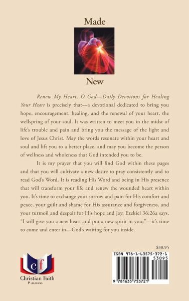 Your heart, Made New Renew My Heart, O God-Daily Devotions for Healing Your Heart is precisely that-a devotional dedicated to bring you hope, encouragement, healing, and the renewal of your heart, the wellspring of your soul. It was written to meet you in the midst of life's trouble and pain and bring you the message of the light and love of Jesus Christ. May the words resonate within your heart and soul and lift you to a better place, and may you become the person of wellness and wholeness that God intended you to be. It is my prayer that you will find God within these pages and that you will cultivate a new desire to pray consistently and to read God's Word. It is reading His Word and being in His presence that will transform your life and renew the wounded heart within you. It's time to exchange your sorrow and pain for His comfort and peace, your guilt and shame for His assurance and forgiveness, and your turmoil and despair for His hope and joy. Ezekiel 36:26a says, "I will give you a new heart and put a new spirit in you;"-it's time to come and enter in-God's waiting for you inside.