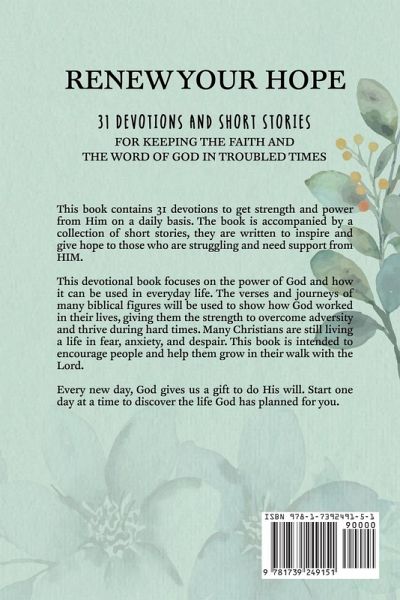 This devotional book focuses on the power of God and how it can be used in everyday life to overcome adversity and personal challenges. You will learn where this strength can heal and help us to overcome our own weaknesses and enemies. Bible verses and journeys of many biblical figures will be used to show how God worked in their lives, giving them the strength to overcome adversity and thrive during hard times. Many Christians are still living a life of fear, anxiety and despair. This book is intended to encourage people and help them grow in their walk with the Lord. Every new day God gives us a gift to do His will. The Bible contains many promises from God for every aspect of our daily lives. Start one day at a time to discover the life God has planned for you. Take a little time each day to grow closer to God on your journey in this life. This book contains 31 Christian devotionals along with bible verses to get strength and power from Him on a daily basis. The book is accompanied by a collection of Christian short stories, they are written to inspire and give hope to those who are struggling and need support from HIM.
