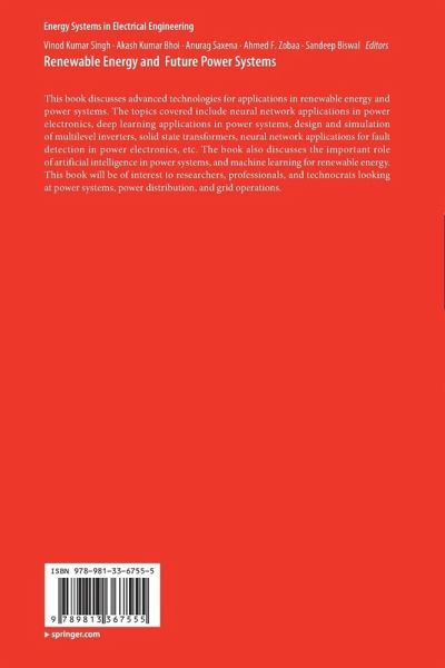 This book discusses advanced technologies for applications in renewable energy and power systems. The topics covered include neural network applications in power electronics, deep learning applications in power systems, design and simulation of multilevel inverters, solid state transformers, neural network applications for fault detection in power electronics, etc. The book also discusses the important role of artificial intelligence in power systems, and machine learning for renewable energy. This book will be of interest to researchers, professionals, and technocrats looking at power systems, power distribution, and grid operations.