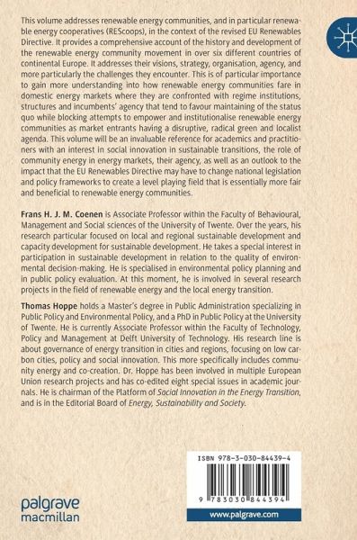 This volume addresses renewable energy communities, and in particular renewable energy cooperatives (REScoops), in the context of the revised EU Renewables Directive. It provides a comprehensive account of the history and development of the renewable energy community movement in over six different countries of continental Europe. It addresses their visions, strategy, organisation, agency, and more particularly the challenges they encounter. This is of particular importance to gain more understanding into how renewable energy communities fare in domestic energy markets where they are confronted with regime institutions, structures and incumbents' agency that tend to favour maintaining of the status quo while blocking attempts to empower and institutionalise renewable energy communities as market entrants having a disruptive, radical green and localist agenda. This volume will be an invaluable reference for academics and practitioners with an interest in social innovation insustainable transitions, the role of community energy in energy markets, their agency, as well as an outlook to the impact that the EU Renewables Directive may have to change national legislation and policy frameworks to create a level playing field that is essentially more fair and beneficial to renewable energy communities.