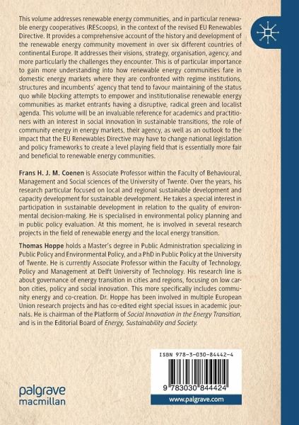 This volume addresses renewable energy communities, and in particular renewable energy cooperatives (REScoops), in the context of the revised EU Renewables Directive. It provides a comprehensive account of the history and development of the renewable energy community movement in over six different countries of continental Europe. It addresses their visions, strategy, organisation, agency, and more particularly the challenges they encounter. This is of particular importance to gain more understanding into how renewable energy communities fare in domestic energy markets where they are confronted with regime institutions, structures and incumbents' agency that tend to favour maintaining of the status quo while blocking attempts to empower and institutionalise renewable energy communities as market entrants having a disruptive, radical green and localist agenda. This volume will be an invaluable reference for academics and practitioners with an interest in social innovation insustainable transitions, the role of community energy in energy markets, their agency, as well as an outlook to the impact that the EU Renewables Directive may have to change national legislation and policy frameworks to create a level playing field that is essentially more fair and beneficial to renewable energy communities.