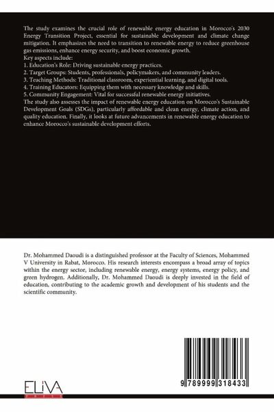 The study examines the crucial role of renewable energy education in Morocco's 2030 Energy Transition Project, essential for sustainable development and climate change mitigation. It emphasizes the need to transition to renewable energy to reduce greenhouse gas emissions, enhance energy security, and boost economic growth. Key aspects include: 1. Education's Role: Driving sustainable energy practices. 2. Target Groups: Students, professionals, policymakers, and community leaders. 3. Teaching Methods: Traditional classroom, experiential learning, and digital tools. 4. Training Educators: Equipping them with necessary knowledge and skills. 5. Community Engagement: Vital for successful renewable energy initiatives. The study also assesses the impact of renewable energy education on Morocco's Sustainable Development Goals (SDGs), particularly affordable and clean energy, climate action, and quality education. Finally, it looks at future advancements in renewable energy education to enhance Morocco's sustainable development efforts.