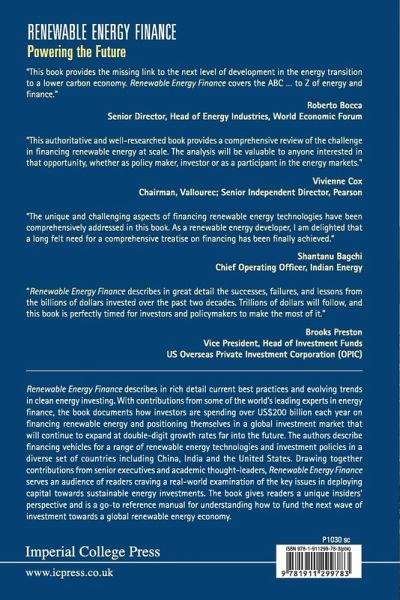 The future of clean energy is no longer about science and technology; it's all about access to finance. The fossil fuel industry has been subsidized for decades with tax breaks and government backing, while renewables have struggled to compete. But now clean energy is the safe bet for investors, as is argued in Renewable Energy Finance: Powering the Future, edited by Dr Charles Donovan, Principal Teaching Fellow at Imperial College Business School. With a foreword by Lord Brown and contributions from some of the world's leading experts in energy finance, this timely book documents how investors are spending over US$250 billion each year on new renewable energy projects and positioning themselves in a global investment market that will continue to expand at double-digit growth rates until 2020. It documents first-hand experiences of the challenges of balancing risk and return amid volatile market conditions and rapid shifts in government policy. Renewable Energy Finance provides an insider's perspective on renewable energy transactions, and insight into how countries like the US, India and China are responding to the global energy challenge. Drawing together contributions from senior executives and leading academics, Renewable Energy Finance serves an audience of readers craving intelligent, practical perspectives on the future of clean energy investment.