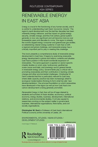 This book argues that the expansion of renewable energy in East Asia forms an integral part of the region's new developmentalism, which is defined as revitalised and refocused forms of state capacity aimed at realising the transformative economic objectives associated with low carbon development.