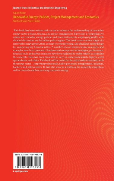 This book has been written with an aim to enhance the understanding of renewable energy sector policies, finance, and project management. It provides a comprehensive update on renewable energy policies and fiscal instruments, employed globally, with detailed discussions on the Indian policy regime. The book covers various stages of a renewable energy project, from concept to commissioning, and elucidates methodology for computing key financial ratios. A number of case studies, business models, and examples have been presented. Fundamental concepts on technologies, performance, financial tools, and carbon emissions have been explained to enable readers to assimilate the concepts. Data has been presented in easy-to-understand charts, figures, excel spreadsheets, and tables. This book will be useful for the stakeholders associated with the energy sector - corporate professionals, utility personnel, entrepreneurs, investors, bankers, and policymakers. It shall also serve as a textbook for university students as well as research scholars pursuing courses in energy.