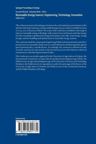 This volume presents refereed papers based on the oral and poster presentations at the 4th International Conference on Renewable Energy Sources, which was held from June 20 to 23, 2017 in Krynica, Poland. The scope of the conference included a wide range of topics in renewable energy technology, with a major focus on biomass and solar energy, but also extending to geothermal energy, heat pumps, fuel cells, wind energy, energy storage, and the modeling and optimization of renewable energy systems. The conference had the unique goal of gathering Polish and international researchers' perspectives on renewable energy sources, and furthermore of balancing them against governmental policy considerations. Accordingly, the conference offered not only scientific sessions but also panels to discuss best practices and solutions with local entrepreneurs and federal government bodies. The Conference was jointly organized by the University of Agriculture in Krakow, the International Commissionof Agricultural and Biosystems Engineering (CIGR), the Polish Society of Agricultural Engineering, AGH University of Science and Technology (Krakow), the Polish Society for Agrophysics under the patronage of the Rector of the University of Agriculture in Krakow, and the Polish Chamber of Ecology.