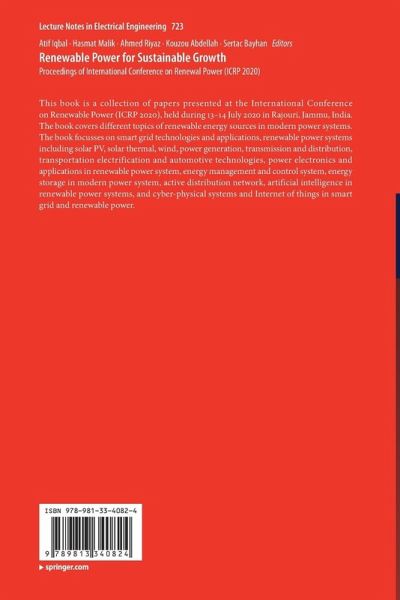 This book is a collection of papers presented at the International Conference on Renewable Power (ICRP 2020), held during 13-14 July 2020 in Rajouri, Jammu, India. The book covers different topics of renewable energy sources in modern power systems. The book focusses on smart grid technologies and applications, renewable power systems including solar PV, solar thermal, wind, power generation, transmission and distribution, transportation electrification and automotive technologies, power electronics and applications in renewable power system, energy management and control system, energy storage in modern power system, active distribution network, artificial intelligence in renewable power systems, and cyber-physical systems and Internet of things in smart grid and renewable power.