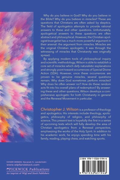 Why do you believe in God? Why do you believe in the Bible? Why do you believe in miracles? These are questions that Christians are often asked by sceptics. The field of apologetics attempts to provide rational answers to these and other questions. Unfortunately, apologetical answers to these questions are often abstract and philosophical. However, the Christian apologist/evangelist has a much more powerful argument in their arsenal: the argument from miracles. Miracles are the original Christian apologetic. It was through the witnessing of miracles that Christianity was originally spread. By applying modern tools of philosophical inquiry and scientific methodology, Wilson is able to establish a core set of miracles which defy naturalistic explanations and strongly point toward occurrences of Special Divine Action (SDA). However, once these occurrences are proven to be genuine miracles, several questions remain. Why does God sometimes perform miracles? Why does he often answer no? How do these random acts fit into his overall plans of redemption? By answering these and other questions, Wilson develops a comprehensive apologetic for both Christianity in general and the Renewal Movement in particular.