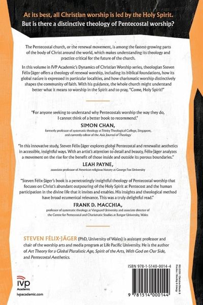At its best, all Christian worship is led by the Holy Spirit. But is there a distinctive theology of Pentecostal worship? The Pentecostal church or the renewal movement is among the fastest-growing parts of the body of Christ around the world, which makes understanding its theology and practice critical for the future of the church. In this volume in IVP Academic's Dynamics of Christian Worship (DCW) series, theologian Steven Félix-Jäger offers a theology of renewal worship, including its biblical foundations, how its global nature is expressed in particular localities, and how charismatic worship distinctively shapes the community of faith. With his guidance, the whole church might understand better what it means to pray, Come, Holy Spirit! The Dynamics of Christian Worship series draws from a wide range of worshiping contexts and denominational backgrounds to unpack the many dynamics of Christian worship--including prayer, reading the Bible, preaching, baptism, the Lord's Supper, music, visual art, architecture, and more--to deepen both the theology and practice of Christian worship for the life of the church.