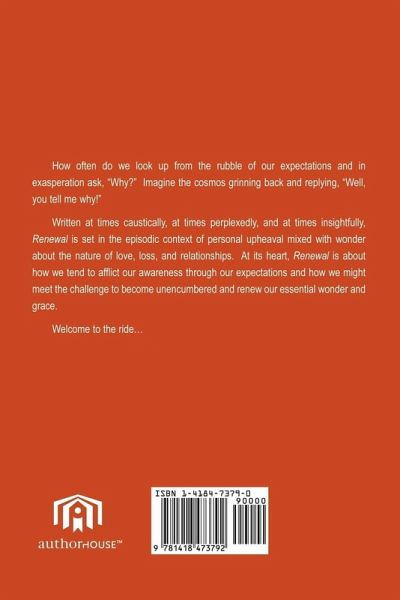 How often do we look up from the rubble of our expectations and in exasperation ask, "Why?" Imagine the cosmos grinning back and replying, "Well, you tell me why!" Written at times caustically, at times perplexedly, and at times insightfully, Renewal is set in the episodic context of personal upheaval mixed with wonder about the nature of love, loss, and relationships. At its heart, Renewal is about how we tend to afflict our awareness through our expectations and how we might meet the challenge to become unencumbered and renew our essential wonder and grace. Welcome to the ride.
