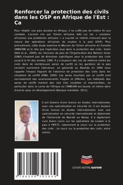 Pour rétablir une paix durable en Afrique, il ne suffit pas de mettre fin aux combats. L'accent mis par l'Union africaine (UA) sur les « solutions africaines aux problèmes africains » a suscité un intérêt croissant pour la nature des opérations africaines de soutien à la paix (OSP). Plus précisément, cette étude examine la Mission de l'Union africaine en Somalie (AMISOM) et le rôle que l'opération joue dans la protection des civils. Selon (Holt et al., 2009), les missions de paix de l'Organisation des Nations Unies (ONU) n'avaient pas de directives spécifiques pour la protection des civils jusqu'à la fin des années 1990. Il y a toujours des cas de violence contre les civils dans de nombreuses zones de conflit où les gardiens de la paix seraient autrement intervenus. Le génocide au Rwanda en 1994 nous rappelle l'impact flagrant de l'absence de protection des civils dans les situations de conflit (ONU, 2000). Les zones touchées par un conflit sont normalement des environnements fragiles et difficiles. Les habitants des zones de conflit mènent des vies très instables et imprévisibles, en particulier dans la corne de l'Afrique où l'AMISOM est basée, et même dans d'autres pays en développement (Banque mondiale, 2011).