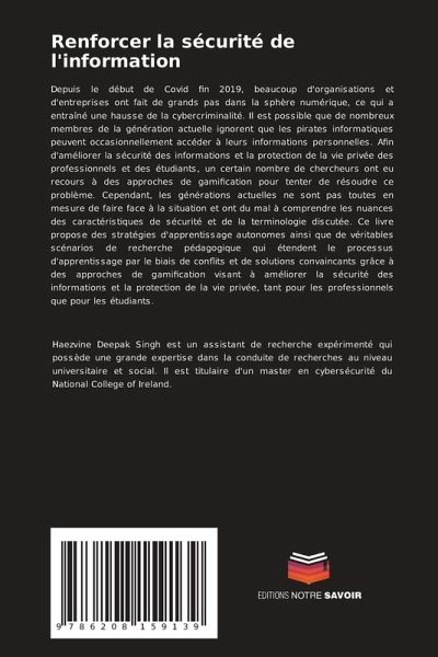 Depuis le début de Covid fin 2019, beaucoup d'organisations et d'entreprises ont fait de grands pas dans la sphère numérique, ce qui a entraîné une hausse de la cybercriminalité. Il est possible que de nombreux membres de la génération actuelle ignorent que les pirates informatiques peuvent occasionnellement accéder à leurs informations personnelles. Afin d'améliorer la sécurité des informations et la protection de la vie privée des professionnels et des étudiants, un certain nombre de chercheurs ont eu recours à des approches de gamification pour tenter de résoudre ce problème. Cependant, les générations actuelles ne sont pas toutes en mesure de faire face à la situation et ont du mal à comprendre les nuances des caractéristiques de sécurité et de la terminologie discutée. Ce livre propose des stratégies d'apprentissage autonomes ainsi que de véritables scénarios de recherche pédagogique qui étendent le processus d'apprentissage par le biais de conflits et de solutions convaincants grâce à des approches de gamification visant à améliorer la sécurité des informations et la protection de la vie privée, tant pour les professionnels que pour les étudiants.