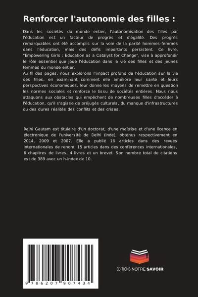 Dans les sociétés du monde entier, l'autonomisation des filles par l'éducation est un facteur de progrès et d'égalité. Des progrès remarquables ont été accomplis sur la voie de la parité hommes-femmes dans l'éducation, mais des défis importants persistent. Ce livre, "Empowering Girls : Education as a Catalyst for Change", vise à approfondir le rôle essentiel que joue l'éducation dans la vie des filles et des jeunes femmes du monde entier.Au fil des pages, nous explorons l'impact profond de l'éducation sur la vie des filles, en examinant comment elle améliore leur santé et leurs perspectives économiques, leur donne les moyens de remettre en question les normes sociales et renforce le tissu de sociétés entières. Nous nous attaquons aux obstacles qui empêchent de nombreuses filles d'accéder à l'éducation, qu'il s'agisse de préjugés culturels, du manque d'infrastructures ou des dures réalités des conflits et des crises.