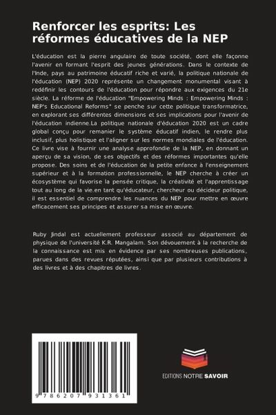 L'éducation est la pierre angulaire de toute société, dont elle façonne l'avenir en formant l'esprit des jeunes générations. Dans le contexte de l'Inde, pays au patrimoine éducatif riche et varié, la politique nationale de l'éducation (NEP) 2020 représente un changement monumental visant à redéfinir les contours de l'éducation pour répondre aux exigences du 21e siècle. La réforme de l'éducation "Empowering Minds : Empowering Minds : NEP's Educational Reforms" se penche sur cette politique transformatrice, en explorant ses différentes dimensions et ses implications pour l'avenir de l'éducation indienne.La politique nationale d'éducation 2020 est un cadre global conçu pour remanier le système éducatif indien, le rendre plus inclusif, plus holistique et l'aligner sur les normes mondiales de l'éducation. Ce livre vise à fournir une analyse approfondie de la NEP, en donnant un aperçu de sa vision, de ses objectifs et des réformes importantes qu'elle propose. Des soins et de l'éducation de la petite enfance à l'enseignement supérieur et à la formation professionnelle, le NEP cherche à créer un écosystème qui favorise la pensée critique, la créativité et l'apprentissage tout au long de la vie.en tant qu'éducateur, chercheur ou décideur politique, il est essentiel de comprendre les nuances du NEP pour mettre en oeuvre efficacement ses principes et assurer sa mise en oeuvre.