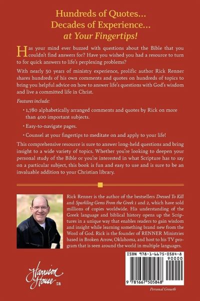 Hundreds of Quotes... Decades of Experience... at Your Fingertips! Has your mind ever buzzed with questions about the Bible that you couldn't find answers for? Have you wished you had a resource to turn to for quick answers to life's perplexing problems? With nearly 50 years of ministry experience, prolific author Rick Renner shares hundreds of his own comments and quotes on hundreds of topics to bring you helpful advice on how to answer life's questions with God's wisdom and live a committed life in Christ. Features include:1,780 alphabetically arranged comments and quotes by Rick on more than 400 important subjects. Easy-to-navigate pages. Counsel at your fingertips to meditate on and apply to your life! This comprehensive resource is sure to answer long-held questions and bring insight to a wide variety of topics. Whether you're looking to deepen your personal study of the Bible or you're interested in what Scripture has to say on a particular subject, this book is fun and easy to use and is sure to be an invaluable addition to your Christian library.