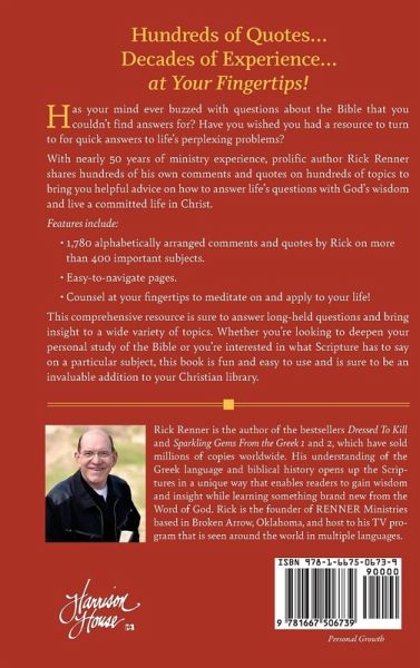 Hundreds of Quotes... Decades of Experience... At Your Fingertips! Has your mind ever buzzed with questions about the Bible that you couldn't find answers for? Have you wished you had a resource to turn to for quick answers to life's perplexing problems? With nearly 50 years of ministry experience, prolific author Rick Renner shares hundreds of his own comments and quotes on hundreds of topics to bring you helpful advice on how to answer life's questions with God's wisdom and live a committed life in Christ. Features include: 1,780 alphabetically arranged comments and quotes by Rick on more than 400 important subjects. Easy-to-navigate pages. Counsel at your fingertips to meditate on and apply to your life! This comprehensive resource is sure to answer long-held questions and bring insight to a wide variety of topics. Whether you're looking to deepen your personal study of the Bible or you're interested in what Scripture has to say on a particular subject, this book is fun and easy to use and is sure to be an invaluable addition to your Christian library.