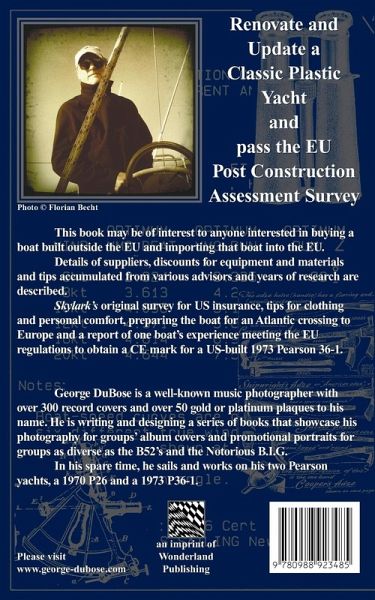 This book may be of interest to anyone interested in buying a boat built outside the EU and importing that boat into the EU. Details of suppliers, discounts for equipment and materials and tips accumulated from various advisors and years of research are described. Skylark's original survey for US insurance, tips for clothing and personal comfort, preparing the boat for an Atlantic crossing to Europe and a report of one boat's experience meeting the EU regulations to obtain a CE mark for a US-built 1973 Pearson 36-1. George DuBose is a well-known music photographer with over 300 record covers and over 50 gold or platinum plaques to his name. He is writing and designing a series of books that showcase his photography for groups' album covers and promotional portraits for groups as diverse as the B52's and the Notorious B.I.G. In his spare time, he sails and works on his two Pearson yachts, a 1970 P26 and a 1973 P36-1.