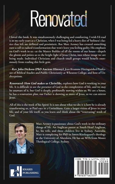 I loved this book. It was simultaneously challenging and comforting. I wish I'd read it in my early years as a Christian, when I was being fed a heavy diet of 'holiness' classics that left me deflated and pessimistic. But Matt Aroney has created something rare: a call to radical transformation that won't leave you feeling guilty. His emphasis on God's work in us-as the Master Builder of all the rooms of our house-dispels the gloom and points us to the bright light of Jesus Christ, into whose image we are being made. Individual Christians and church small groups would benefit enormously from reading this little gem.-Rev. John Dickson (PhD Ancient History), Jean Kvamme Distinguished Professor of Biblical Studies and Public Christianity at Wheaton College, and host of Undeceptions. Renovated: How God makes us Christlike, explores how God is working in your life. It is difficult to see the presence of God in the complexities of life, and we may be unaware of it, but God is deeply, profoundly moving within us. We are a house, he has a renovation plan, our Father is showing us more of Jesus, so we can mirror Jesus. All of this is the work of his Spirit! It is not about what we do; it is how he is already transforming us, as Paul says in 2 Corinthians. Gain a larger vision of Jesus in your life, and of your life itself, as you learn and think about the "renovating" work of God. About the Author:Matt Aroney is passionate about God's work in the ordinary things of life. An Anglican pastor at South Head Anglican, he, his wife, and three children live in Sydney, Australia. Matt is completing his PhD in Søren Kierkegaard's theology at the University of Aberdeen. He has an MTh from Moore Theological College, Sydney.