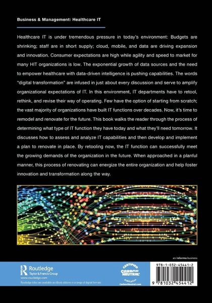 Healthcare IT is under tremendous pressure in today's environment: Budgets are shrinking; staff are in short supply; cloud, mobile, and data are driving expansion and innovation. Consumer expectations are high while agility and speed to market for many HIT organizations is low. The exponential growth of data sources and the need to empower healthcare with data-driven intelligence is pushing capabilities. The words "digital transformation" are infused in just about every discussion and serve to amplify organizational expectations of IT. In this environment, IT departments have to retool, rethink, and revise their way of operating. Few have the option of starting from scratch; the vast majority of organizations have built IT functions over decades. Now, it's time to remodel and renovate for the future. This book walks the reader through the process of determining what type of IT function they have today and what they'll need tomorrow. It discusses how to assess and analyze IT capabilities and then develop and implement a plan to renovate in place. By retooling now, the IT function can successfully meet the growing demands of the organization in the future. When approached in a planful manner, this process of renovating can energize the entire organization and help foster innovation and transformation along the way.