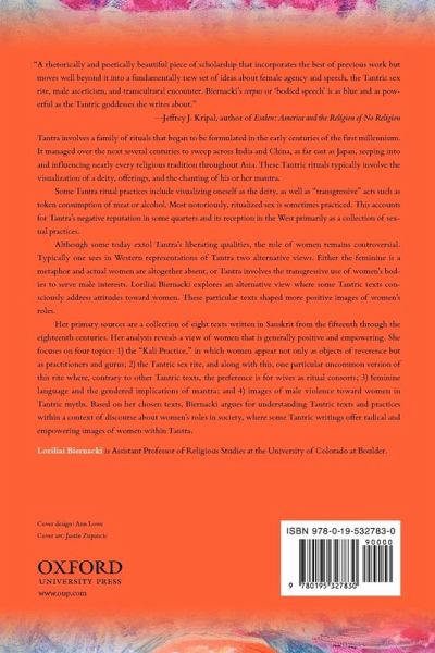 Tantra is a family of rituals modeled on those of the Vedas and their attendant texts and lineages. These rituals typically involve the visualization of a deity, offerings, and the chanting of his or her mantra. Common variations include visualizing the deity in the act of sexual union with a consort, visualizing oneself as the deity, and "transgressive" acts such as token consumption of meat or alcohol. Most notoriously, non-standard or ritualized sex is sometimes practiced. This accounts for Tantra's negative reputation in some quarters and its reception in the West primarily as a collection of sexual practices. Although some today extol Tantra's liberating qualities, the role of women remains controversial. Traditionally there are two views of women and Tantra. Either the feminine is a metaphor and actual women are altogether absent, or Tantra involves the transgressive use of women's bodies to serve male interests. Loriliai Biernacki presents an alternative view, in which women are revered, worshipped, and considered worthy of spiritual attainment. Her primary sources are a collection of eight relatively modern Tantric texts written in Sanskrit from the 15th through the 18th century. Her analysis of these texts reveals a view of women that is generally positive and empowering. She focuses on four topics: 1) the "Kali Practice," in which women appear not only as objects of reverence but as practitioners and gurus; 2) the Tantric sex rite, especially in the case that, contrary to other Tantric texts, the preference is for wives as ritual consorts; 3) feminine language and the gendered implications of mantra; and 4) images of male violence towards women in tantric myths. Biernacki, by choosing to analyse eight particular Sanskrit texts, argues that within the tradition of Tantra there exists a representation of women in which the female is an authoritative, powerful, equal participant in the Tantric ritual practice.