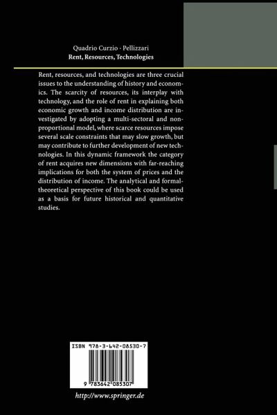 Rent, resources, and technologies are three crucial issues to the understanding of history and economics. The scarcity of resources, its interplay with technology, and the role of rent in explaining both economic growth and income distribution are investigated by adopting a multi-sectoral and non-proportional model, where scarce resources impose several scale constraints that may slow growth, but may contribute to further development of new technologies. In this dynamic framework the category of rent acquires new dimensions with far-reaching implications for both the system of prices and the distribution of income. The analytical and formal-theoretical perspective of this book could be used as a basis for future historical and quantitative studies.