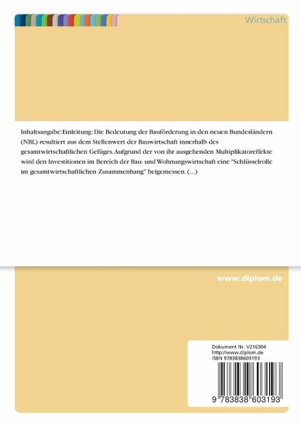 Die Bedeutung der Bauförderung in den neuen Bundesländern (NBL) resultiert aus dem Stellenwert der Bauwirtschaft innerhalb des gesamtwirtschaftlichen Gefüges. Aufgrund der von ihr ausgehenden Multiplikatoreffekte wird den Investitionen im Bereich der Bau- und Wohnungswirtschaft eine "Schlüsselrolle im gesamtwirtschaftlichen Zusammenhang" beigemessen. Sie löst weitreichende Beschäftigungsimpulse aus und gehört zu den wichtigsten Antriebskräften fair Konjunktur und Wachstums. Ähnlich dem Ende der 60er und Anfang der 70er Jahre erfolgten Einsatzes des Wohnungsbaus als wirtschaftspolitischem Instrument werden auch für die NBL positive Effekte bzgl. der allgemeinen wirtschaftlichen Entwicklung erwartete. Jenkis spricht angesichts des hohen Einkommens- und Beschäftigungsmultiplikators von einer "Lokomotive für den wirtschaftlichen Wiederaufbau". Entsprechend diesem hohen Stellenwert betrug der Anteil der Bauinvestitionen am Bruttoinlandsprodukt der NBL 1994 36% (alte Bundesländer: 12%).