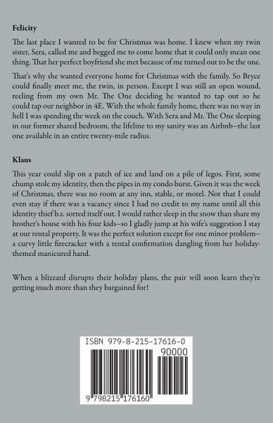 Felicity The last place I wanted to be for Christmas was home. I knew when my twin sister, Sera, called me and begged me to come home that it could only mean one thing. That her perfect boyfriend she met because of me turned out to be the one. That's why she wanted everyone home spending Christmas with the family. So Bryce could finally meet me, the twin, in person. Except I was still an open wound, reeling from my own Mr. The One deciding he wanted to tap out so he could tap our neighbor in 4E. With the whole family home, there was no way in hell I was spending the week on the couch. With Sera and Mr. The One sleeping in our former shared bedroom, the lifeline to my sanity was an AirBnB--the last one available in an entire twenty-mile radius. Klaus This year could slip on a patch of ice and land on a pile of legos. First, some chump stole my identity, then the pipes in my condo burst. Given it was the week of Christmas, there was no room at any inn, stable, or motel. Not that I could even stay if there was a vacancy since I had no credit to my name until all this identity thief b.s. sorted itself out. I would rather sleep in the snow than share my brother's house with his four kids--so I gladly jump at his wife's suggestion I stay at our rental property. It was the perfect solution except for one minor problem--a curvy little firecracker with a rental confirmation dangling from her holiday-themed manicured hand. When a blizzard disrupts their holiday plans, the pair will soon learn they're getting much more than they bargained for!