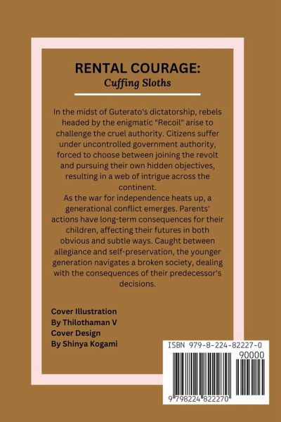 In the tumultuous landscape of Guterato, a continent ensnared by the grip of tyranny, a band of rebels emerges. Led by the enigmatic figure known as "Recoil," they are the Rental Courage, daring to challenge the oppressive forces that have long held their homeland captive. As the government's power goes unchecked, its citizens suffer under its heavy hand. Amidst this backdrop of fear and despair, individuals must make choices: to stand and fight, or to pursue their own clandestine agendas, weaving a web of intrigue that spans the continent. Yet, as the struggle for freedom intensifies, another battle unfolds-one that resonates across generations. The actions of the adults cast long shadows over their children, shaping their lives in ways both seen and unseen. Caught between loyalty and self-preservation, the younger generation must navigate a world torn apart by conflict, grappling with the consequences of their parents' choices. In "Rental Courage: Cuffing Sloths," author Koushik D Eswaar explores the complexities of rebellion and revolution, delving into the profound impact of courage and cowardice on the fabric of society. With vivid prose and compelling characters, this tale invites readers to contemplate the power of choice and the enduring quest for freedom in a world gripped by tyranny.