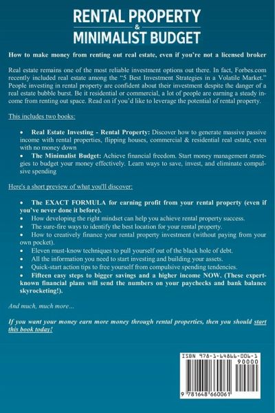 How to make money from renting out real estate, even if you're not a licensed broker Real estate remains one of the most reliable investment options out there. In fact, Forbes.com recently included real estate among the "5 Best Investment Strategies in a Volatile Market." People investing in rental property are confident about their investment despite the danger of a real estate bubble burst. Be it residential or commercial, a lot of people are earning a steady income from renting out space. Read on if you'd like to leverage the potential of rental property. This includes two books: Real Estate Investing - Rental Property: Discover how to generate massive passive income with rental properties, flipping houses, commercial & residential real estate, even with no money down The Minimalist Budget: Achieve financial freedom. Start money management strategies to budget your money effectively. Learn ways to save, invest, and eliminate compulsive spending Here's a short preview of what you'll discover: The EXACT FORMULA for earning profit from your rental property (even if you've never done it before). How developing the right mindset can help you achieve rental property success. The sure-fire ways to identify the best location for your rental property. How to creatively finance your rental property investment (without paying from your own pocket). Eleven must-know techniques to pull yourself out of the black hole of debt. All the information you need to start investing and building your assets. Quick-start action tips to free yourself from compulsive spending tendencies. Fifteen easy steps to bigger savings and a higher income NOW. (These expert-known financial plans will send the numbers on your paychecks and bank balance skyrocketing!). And much, much more… If you want your money earn more money through rental properties, then you should start this book today!