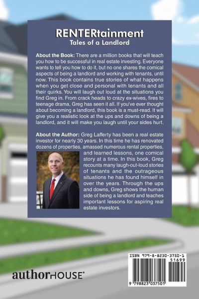 There are hundreds of books on how to build wealth through real estate investing. However, almost none show you what happens when your new tenant turns out to be a crack dealer or your bathtub disappears overnight. In RENTertainment, veteran landlord and accidental comedian Greg Lafferty takes you behind the scenes of his 30-year real estate journey. It is filled with true-and truly outrageous-stories from the front lines of property management. From bizarre maintenance calls and drug-dealing neighbors to frogs in the plumbing and vanishing fixtures, Greg delivers an unfiltered, laugh-out-loud account of life as a landlord. This book is more than entertainment. With each tenant horror story comes a lesson in real estate wisdom. The result is part memoir, part cautionary tale, and part how-to guide for anyone thinking about diving into rental property ownership. Aspiring real estate investors, landlords, and fans of business humor will find valuable insights wrapped in wit and grounded in real-world experience. Whether you are looking to build passive income or just enjoy stories of tenant drama and real estate disasters, RENTertainment offers a front-row seat to the madness. It also reveals the method behind the rental business. Read it. Laugh hard. Learn smarter.