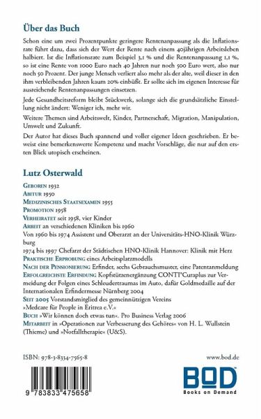 Schon eine um zwei Prozentpunkte geringere Rentenanpassung als die Inflationsrate führt dazu, dass sich der Wert der Rente nach einem 40jährigen Arbeitsleben halbiert. Ist die Inflationsrate zum Beispiel 3,1% und die Rentenanpassung 1,1 %, so ist eine Rente von 1000 Euro nach 40 Jahren nur noch 500 Euro wert, also nur noch 50 Prozent. Der junge Mensch verliert also mehr als der alte, weil dieser in den ihm verbleibenden Jahren kaum 20% einbüßt. Er sollte sich im eigenen Interesse für ausreichende Rentenanpassungen einsetzen.Jede Gesundheitsreform bleibt Stückwerk, solange sich die grundsätzliche Einstellung nicht ändert: Weniger ich, mehr wir.Weitere Themen sind Arbeitswelt, Kinder, Partnerschaft, Migration, Manipulation, Umwelt und Zukunft.Der Autor hat dieses Buch spannend und voller eigener Ideen geschrieben. Er beweist eine bemerkenswerte Kompetenz und macht Vorschläge, die nur auf den ersten Blick utopisch erscheinen.