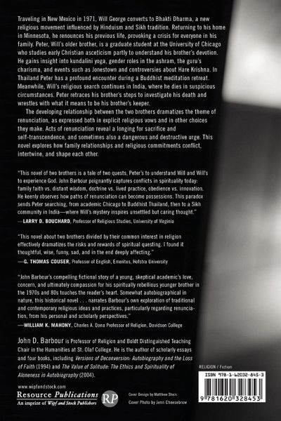 Traveling in New Mexico in 1971, Will George converts to Bhakti Dharma, a new religious movement influenced by Hinduism and Sikh tradition. Returning to his home in Minnesota, he renounces his previous life, provoking a crisis for everyone in his family. Peter, Will's older brother, is a graduate student at the University of Chicago who studies early Christian asceticism partly to understand his brother's devotion. He gains insight into kundalini yoga, gender roles in the ashram, the guru's charisma, and events such as Jonestown and controversies about Hare Krishna. In Thailand Peter has a profound encounter during a Buddhist meditation retreat. Meanwhile, Will's religious search continues in India, where he dies in suspicious circumstances. Peter retraces his brother's steps to investigate his death and wrestles with what it means to be his brother's keeper. The developing relationship between the two brothers dramatizes the theme of renunciation, as expressed both in explicit religious vows and in other choices they make. Acts of renunciation reveal a longing for sacrifice and self-transcendence, and sometimes also a dangerous and destructive urge. This novel explores how family relationships and religious commitments conflict, intertwine, and shape each other.