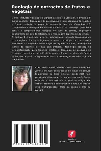 O livro, intitulado 'Reologia de Extratos de Frutas e Vegetais', é dividido em quatro capítulos: tecnologias de preservação e industrialização de vegetais e frutas, reologia da polpa de carambola (Averrhoa Carambola L.), comportamento reológico do extrato da casca de maracujá (Passiflora edulis) e comportamento reológico do suco de tomate, englobando cisalhamento em estado estacionário e modelagem dependente do tempo.O capítulo 1 é dedicado a vários subcapítulos, incluindo tecnologias de conservação a frio para legumes e frutas, tecnologia de conservação envolvendo a secagem e desidratação de legumes e frutas, tecnologia de fabrico de legumes e frutas semi-enlatados, tecnologia baseada na termoesterilização para legumes enlatados, tecnologia de produção de produtos concentrados a partir de legumes e frutas, tecnologia de fabrico de bebidas a partir de legumes e frutas e tecnologias de valorização de subprodutos.