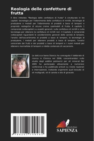 Il libro intitolato "Reologia delle confetture di frutta" è strutturato in tre capitoli: tecnologia per l'ottenimento della confettura di mirtilli, tecnologie di produzione e metodi per l'ottenimento di prodotti a base di lamponi e proprietà reologiche di alcune creme spalmabili di frutta. Il capitolo 1 comprende sottocapitoli su aspetti generali, sulla confettura di mirtilli e sulla tecnologia per ottenere la confettura di mirtilli neri. Il Capitolo 2 comprende sottocapitoli riguardanti le caratteristiche generali delle varietà di lamponi, l'analisi dell'assortimento di prodotti a base di lamponi, le tecnologie di produzione, i metodi per ottenere prodotti a base di lamponi, l'analisi sensoriale dei frutti e dei prodotti a base di lamponi e i nuovi metodi per ottenere marmellate di lamponi a ridotto contenuto di saccarosio.