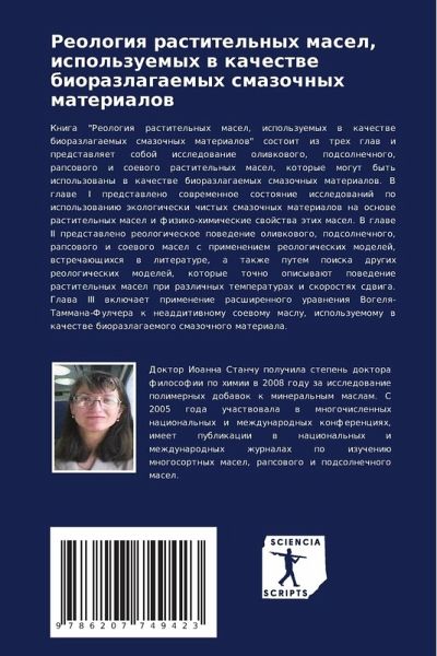 Kniga "Reologiq rastitel'nyh masel, ispol'zuemyh w kachestwe biorazlagaemyh smazochnyh materialow" sostoit iz treh glaw i predstawlqet soboj issledowanie oliwkowogo, podsolnechnogo, rapsowogo i soewogo rastitel'nyh masel, kotorye mogut byt' ispol'zowany w kachestwe biorazlagaemyh smazochnyh materialow. V glawe I predstawleno sowremennoe sostoqnie issledowanij po ispol'zowaniü äkologicheski chistyh smazochnyh materialow na osnowe rastitel'nyh masel i fiziko-himicheskie swojstwa ätih masel. V glawe II predstawleno reologicheskoe powedenie oliwkowogo, podsolnechnogo, rapsowogo i soewogo masel s primeneniem reologicheskih modelej, wstrechaüschihsq w literature, a takzhe putem poiska drugih reologicheskih modelej, kotorye tochno opisywaüt powedenie rastitel'nyh masel pri razlichnyh temperaturah i skorostqh sdwiga. Glawa III wklüchaet primenenie rasshirennogo urawneniq Vogelq-Tammana-Fulchera k neadditiwnomu soewomu maslu, ispol'zuemomu w kachestwe biorazlagaemogo smazochnogo materiala.