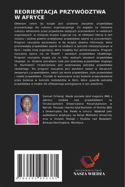 G¿ównym celem tej ksi¿¿ki jest ustalenie znaczenia przywództwa pracowniczego dla sukcesu organizacyjnego. Ze wzgl¿du na niedawne sukcesy odniesione przez przywódców b¿d¿cych pracownikami w niektórych organizacjach, w niniejszej ksi¿¿ce sugeruje si¿, ¿e efektywni liderzy w tym stuleciu i pó¿niej powinni praktykowä przywództwo oparte na pracownikach. Program nauczania opracowany w tej ksi¿¿ce zawiera informacje, które promowäyby przywództwo oparte na s¿u¿bach w ko¿ciele metodystycznym w Kenii i kädej innej organizacji, która mog¿aby by¿ zainteresowana. Program nauczania opiera si¿ na filozofii i zasadach przywództwa s¿u¿ebnego. Program nauczania skupia si¿ na kilku wänych zasadach przywództwa s¿ugiego: a). S¿u¿enie potrzebom ludzi jest podstaw¿ przywództwa s¿ugiego; b). Duchowo¿¿ chrze¿cijäska jest podstawow¿ potrzeb¿ przywództwa s¿u¿ebnego. Ten program nauczania jest wynikiem badä w obszarach zwi¿zanych z przywództwem, takich jak teoria przywództwa, style przywództwa i rozwój przywództwa. Zostäo to wymuszone przez badanie przeprowadzone przez badacza w ko¿ciele metodystów w Kenii, które ujawni¿o potrzeb¿ przywództwa w s¿u¿bie dla efektywnego pos¿ugiwania w tym pokoleniu.