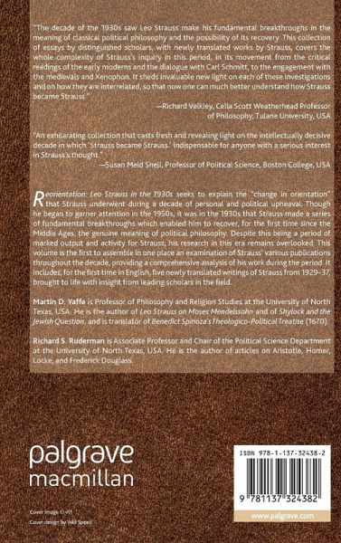 Introduction; Martin D. Yaffe and Richard S. Ruderman 1. How Strauss Became Strauss; Heinrich Meier 2. Spinoza's Critique of Religion: Reading Too Literally and Not Reading Literally Enough; Steven Frank 3. The Light Shed on the Crucial Development of Strauss's Thought by his Correspondence with Gerhard Krüger; Thomas L. Pangle 4. Strauss on Hermann Cohen's 'Idealizing' Appropriation of Maimonides as a Platonist; Martin D. Yaffe 5. Strauss on the Religious and Intellectual Situation of the Present; Timothy W. Burns 6. Carl Schmitt and Strauss's Return to Pre-Modern Philosophy; Nasser Behnegar 7. Strauss, Hobbes, and the Origins of Natural Science; Timothy W. Burns 8. Strauss on Farabi, Maimonides, et al. in the 1930s; Joshua Parens 9. The Problem of the Enlightenment: Strauss, Jacobi, and the Pantheism Controversy; David Janssens 10. 'Through the Keyhole': Strauss's Rediscovery of Classical Political Philosophy in Xenophon's Constitution of the Lacedaemonians; Richard S. Ruderman 11. Strauss and Schleiermacher on How to Read Plato: An Introduction to 'Exoteric Teaching'; Hannes Kerber Appendix: Seven Writings by Leo Strauss A. 'Conspectivism' (1929); Translated by Anna Schmidt and Martin D. Yaffe B. 'Religious Situation of the Present' (1930); Translated by Anna Schmidt and Martin D. Yaffe C. 'The Intellectual Situation of the Present' (1932); Translated by Anna Schmidt and Martin D. Yaffe D. 'A Lost Writing of Farâbî's' (1936); Translated by Gabriel Bartlett and Martin D. Yaffe E. 'On Abravanel's Critique of Monarchy' (1937); Translated by Martin D. Yaffe F. 'Exoteric Teaching' (1939); Edited by Hannes Kerber G. Lecture Notes for 'Persecution and the Art of Writing' (1939); Edited by Hannes Kerber