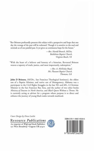 Rev Brinson profoundly presents this subject with a perspective and hope that one day the wrongs of the past will be redressed. Though it is sensitive to the soul and reminds us of our painful past, it yet gives us continuous hope for the future."" Rev. Harold Branch, M/Div, Bethlehem Baptist Church, Virginia Beach, VA With the heart of a believer and honesty of a historian, Reverend Brinson weaves a tapestry of truth, justice, and most importantly, redemption."" Rev. A. McKinley Royal, Mt. Pleasant Baptist Church, Thomson, GA John D Brinson, (M.Div., San Francisco Theological Seminary), the oldest son of a Baptist Minister, and native son of Montgomery, Alabama, was a participant in the Civil Rights Struggles in the late 50's and 60's. A Christian Minister in the San Francisco Bay Area, and the author of two other books: 'Ministry of Deacons in North America', and 'Black Queen Without a Throne'. He is currently acting as advisor for a program whose purpose is to direct and enhance the journey of young black males towards manhood.